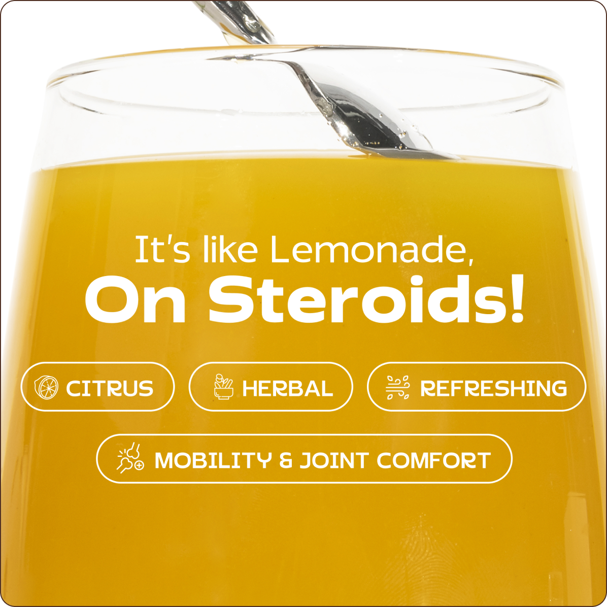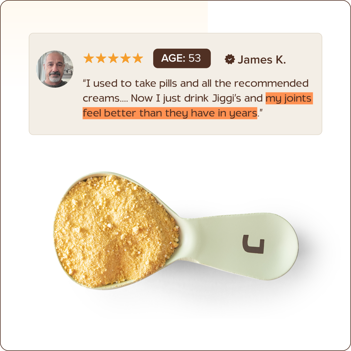 When’s the last time you were excited to take fish oil, glucosamine, or a chalky calcium pill? Probably never. Jiggies changes that. With a light, citrusy flavor, it feels like a refreshing glass of lemonade. Simply stir one scoop into warm or cold water and enjoy — while behind the taste, 53 nutrients are working to calm inflammation, nourish your joints, and keep you moving with ease.